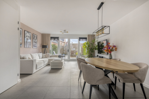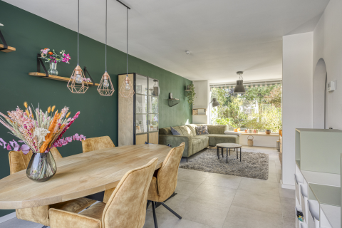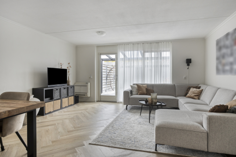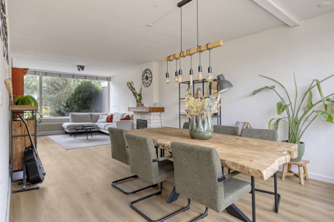 Vanuit de hal kom je in de open leefruimte, waar direct de royale ruimte én de slimme indeling opvallen. De gehele begane grond is afgewerkt met een sfeervolle duoplank houten vloer, gecombineerd met strak gestucte wanden en plafonds die zorgen voor een luxe uitstraling. Dankzij de uitbouw is hier volop leefruimte ontstaan, waar je moeiteloos meerdere functies combineert. Zo is er aan de voorzijde ruimte voor een grote hoekbank en een gezellige tv-hoek. Achter kun je een royale eettafel kwijt waar het hele gezin kan aanschuiven, maar er blijft ook nog voldoende plek over voor bijvoorbeeld een speelhoek voor de kinderen of een fijne thuiswerkplek.